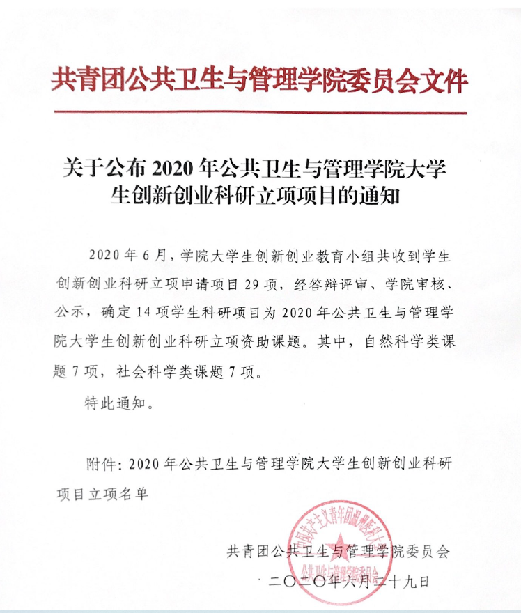 关于公布2020年公共卫生与管理学院大学生创新创业科研立项项目的通知